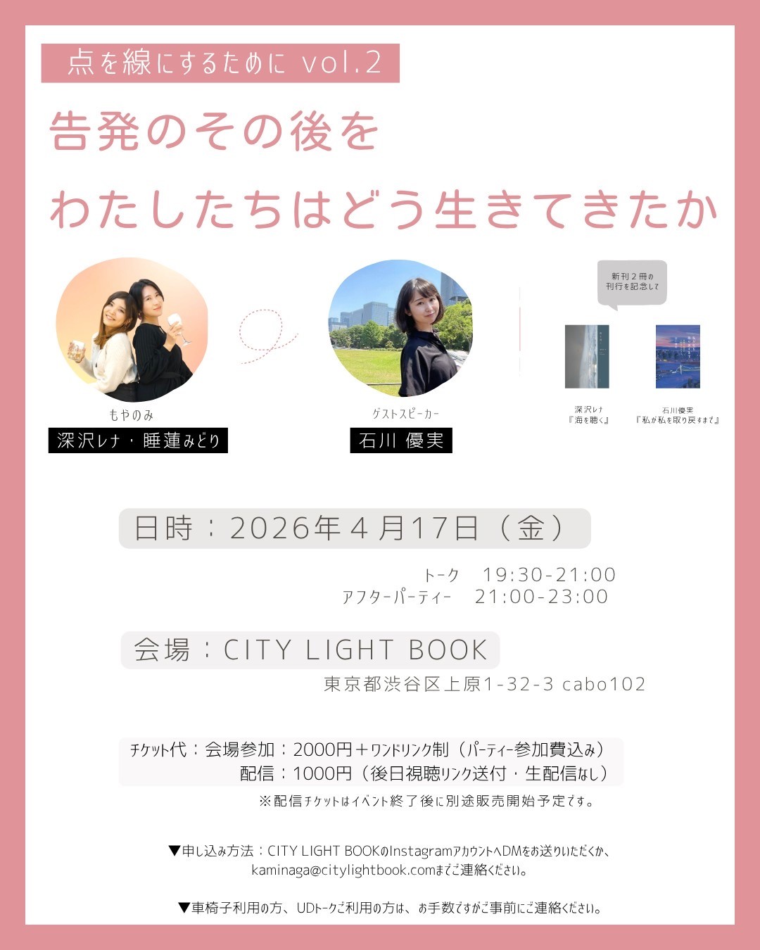 ⚪︎会場参加→当アカウントへDMまたはメールkaminaga@citylightbook.comへ「イベント名」「お名前」をお知らせください。会場満員となり次第、締切とさせて頂きます。