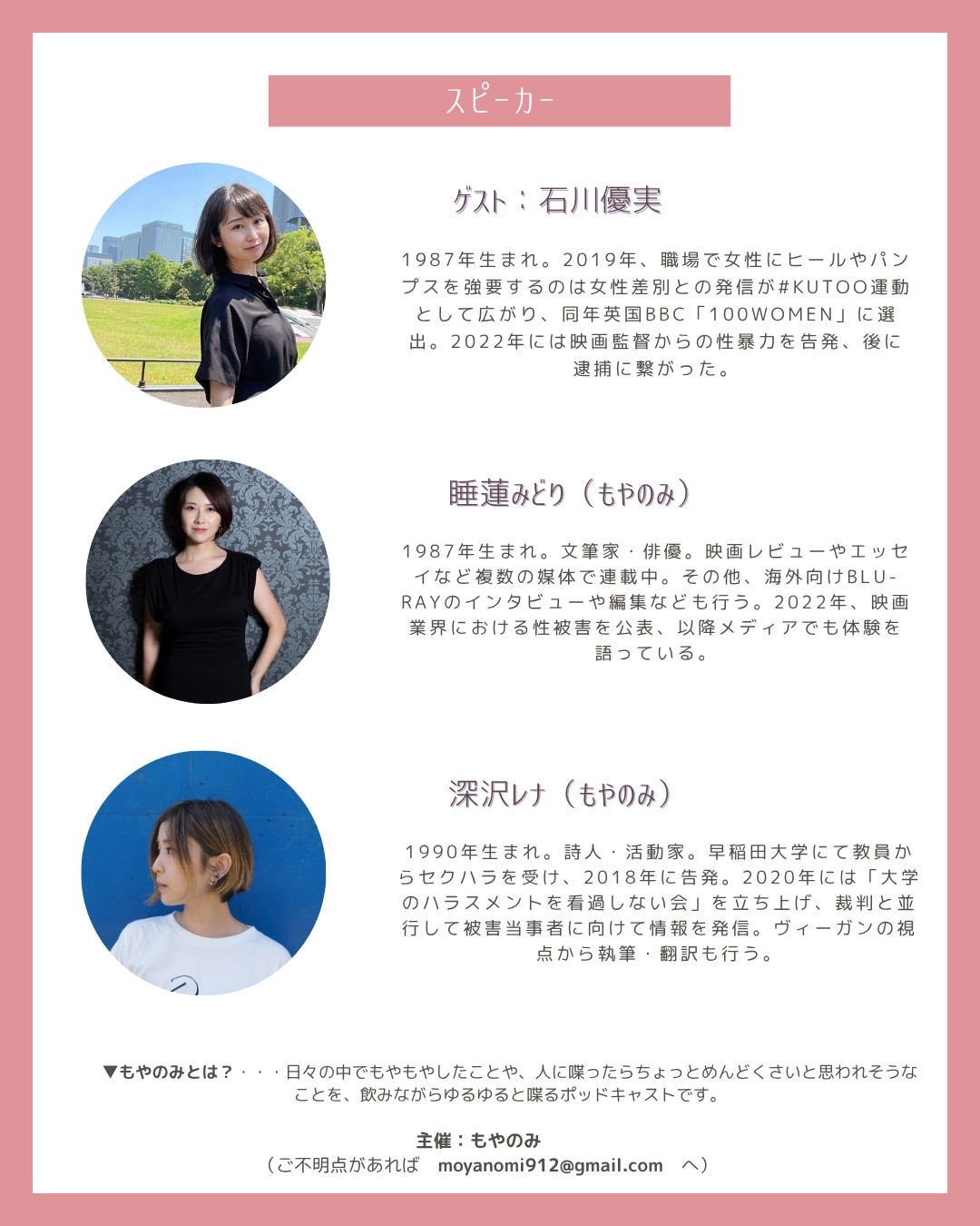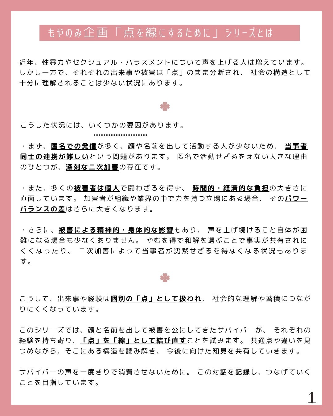 前回のイベントでは、サバイバー3人がそれぞれの経験をもとに、これまで見てきた二次加害について対話を行いました。今回は、「告発のその後をわたしたちはどう生きてきたか」をテーマに対話を行い、「その後」を生きることの困難や、被害者支援に何が足りていないのか、どのような支援が必要とされているのかを、サバイバーの視点から具体的に考えます。