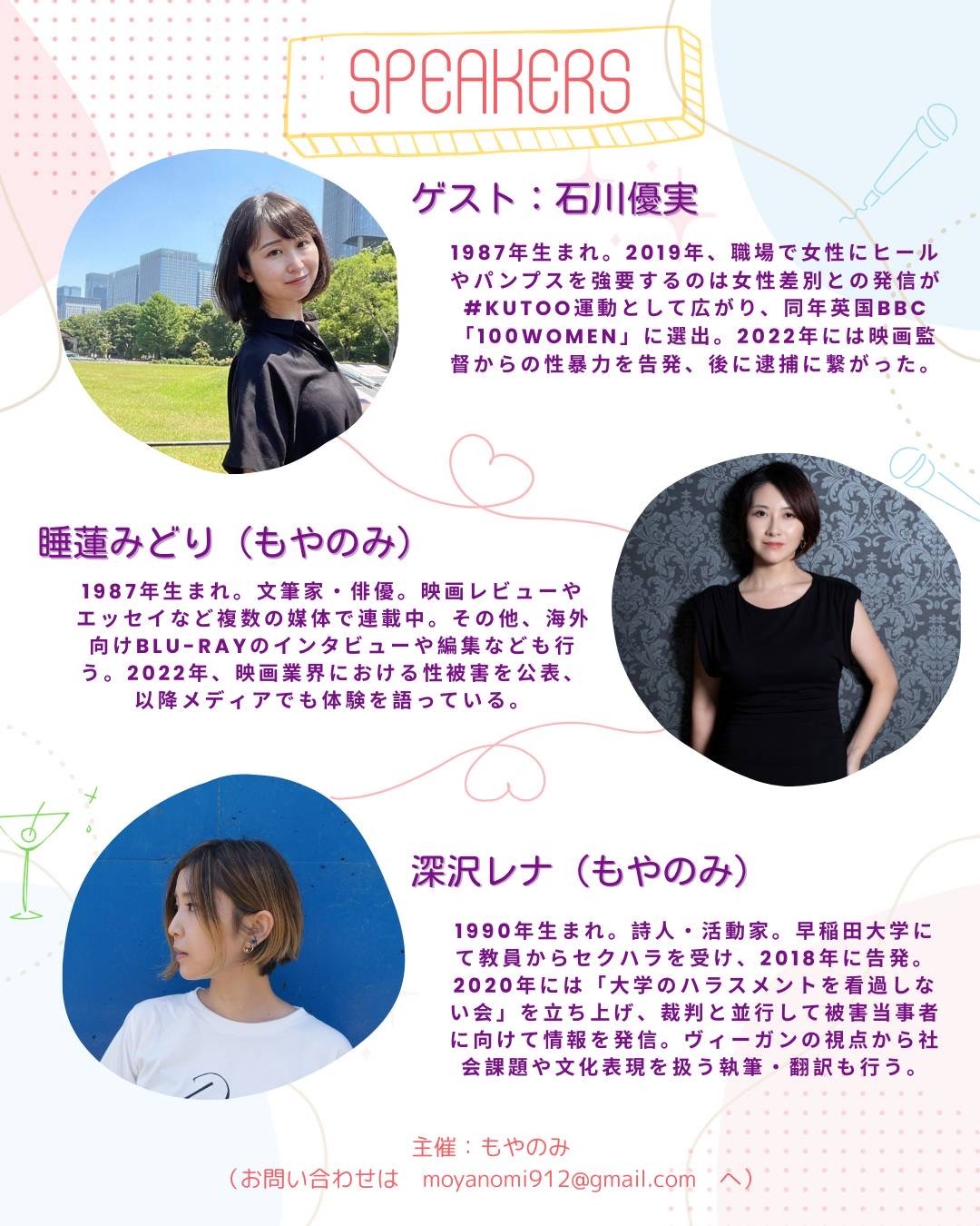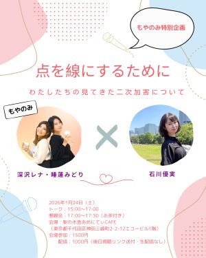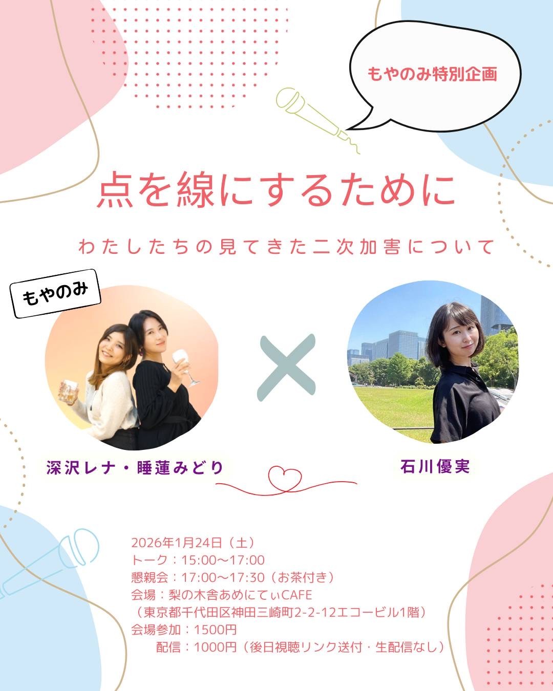 このイベントは告発の場ではなく、一緒に考え、つながるための場を目指します。ポッドキャスト「睡蓮みどりと深沢レナのもやのみ」企画イベント、記念すべき第一弾。※このチケットは会場参加用です。配信用のチケットはイベント後に発売となります。